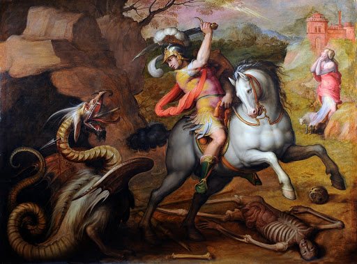 1.Si conosce molto poco della vita di san Giorgio. Si sa che visse in Palestina e che morì nella piccola città di Lidda, sempre in Palestina. Morì martire verso il 303, quindi prima dell’avvento di Costantino. E proprio a Lidda fu innalzata una basilica in suo onore. San Giorgio divenne famosissimo durante il medioevo ed è tuttora molto famoso in quanto santo patrono dell’Inghilterra. A san Giorgio è legata una leggenda secondo la quale sarebbe riuscito a combattere contro un drago per liberare una fanciulla di nome Alessandra, che diventerà cristiana grazie all’impresa del Santo. Nelle fiabe e nelle saghe la vittoria sui draghi costituisce spesso una prova che l’eroe deve superare per ottenere un bene. Un bene che può essere un tesoro o, appunto, la liberazione di una fanciulla prigioniera. Il Cristianesimo ha sempre visto nel drago il demonio, in particolar modo Lucifero ribelle che poi viene sconfitto da san Michele e precipitato nell’inferno: “(…) apparve un altro segno nel cielo: un enorme drago rosso, con sette teste e dieci corna e sulle teste sette diademi (…).” (Apocalisse 12). Allora soffermiamoci su tre elementi.