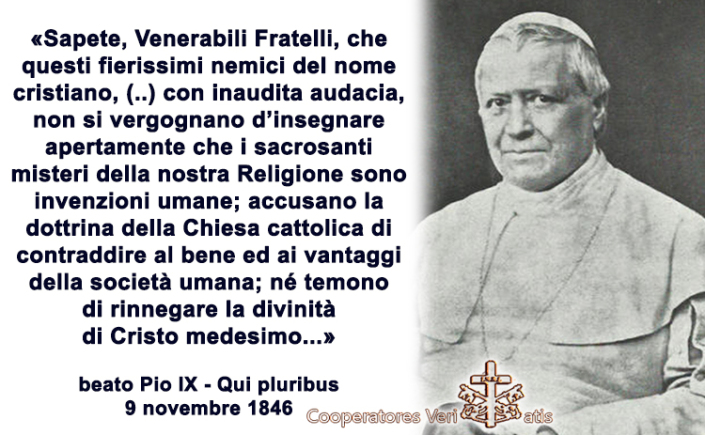 Sapete, Venerabili Fratelli, che questi fierissimi nemici del nome cristiano, miseramente tratti da un cieco impeto di folle empietà, sono giunti a tale temerità di opinioni che “aprendo la bocca a bestemmiare Iddio” (Ap 13,6) con inaudita audacia, non si vergognano d’insegnare apertamente che i sacrosanti misteri della nostra Religione sono invenzioni umane; accusano la dottrina della Chiesa cattolica di contraddire al bene ed ai vantaggi della società umana; né temono di rinnegare la divinità di Cristo medesimo. E per potere più facilmente sedurre i popoli ed ingannare gl’incauti e gl’inesperti, si vantano che solo a loro siano note le vie della prosperità umana; né dubitano di arrogarsi il nome di filosofi, quasi che la filosofia, che si aggira tutta nella investigazione delle verità naturali, debba rifiutare quelle che lo stesso supremo e clementissimo autore della natura, Iddio, per singolare beneficio e misericordia si è degnato di manifestare agli uomini, affinché conseguano vera felicità e salvezza. Quindi con fallace e confuso argomento non cessano mai di magnificare la forza e l’eccellenza della ragione umana contro la fede santissima di Cristo, e audacemente blaterano che la medesima ripugna alla ragione umana. Del che niente si può pensare od immaginare né di più stolto, né di più empio, né di più ripugnante alla ragione medesima. Sebbene infatti la fede sia al di sopra della ragione, pur tuttavia fra di esse non si può trovare nessuna vera discordanza e nessun dissidio, quando ambedue prendono origine da una stessa fonte d’immutabile ed eterna verità, da Dio Ottimo Massimo; e per tale motivo vicendevolmente si aiutano, di modo che la retta ragione dimostra e difende la verità della fede, e la fede libera la ragione da ogni errore e mirabilmente la illustra, la rafforza e la perfeziona con la cognizione delle cose divine.