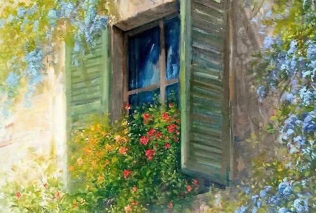 3.Sul davanzale di una finestra ci sono troppi fiori. Sono incolti, ma freschi. Si capisce facilmente che si tratta di una finestra che da tempo non viene aperta. Forse, chissà, una finestra di una stanza ormai disabitata. Ma c’è una cornice di freschezza che la circonda. I glicini rampicanti ad adornarla tutta. E poi, tanti, troppi fiori, colorati a coprirla per intero….quasi come se la volessero conservare.