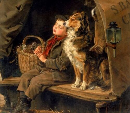 La scena è chiara: un bambino si è assopito perché stanco. Si è dovuto destare quando ancora non albeggiava per aiutare il papà ad andare a vendere al mercato. Quando tornerà a casa, apprezzerà ancora di più i giochi spensierati con il suo amico cane; che adesso, inconsapevolmente, gli è accanto sereno mostrando una significativa fierezza per la generosità e l’obbedienza del suo padroncino.