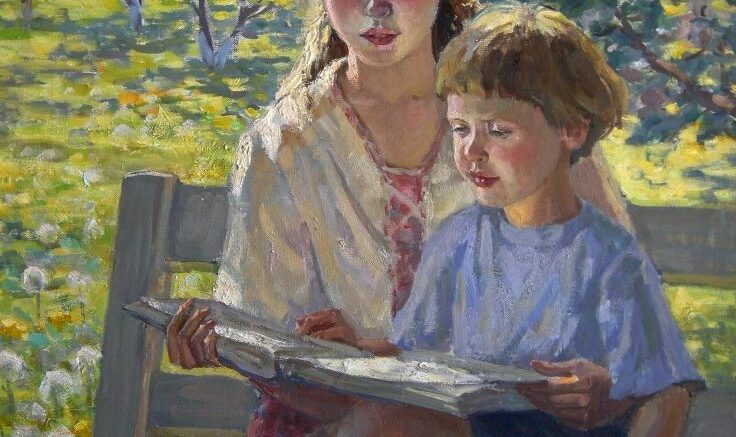 Un’adolescente tiene in braccio un bambino, forse il suo fratellino. Giocherà a fare la mamma? Può darsi. Gli sta leggendo una fiaba. Vuole trasmettergli l’incanto. D’altronde è proprio delle mamme educare a questo i propri figli. Far sì che possano allargare lo sguardo. Che possano avere occhi che conservino la meraviglia. Che possono capire che ciò che può saziare è solo…il Sommo Vero, il Sommo Buono e il Sommo Bello.